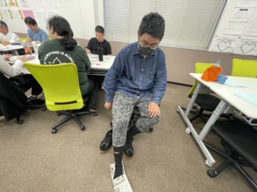 ホワイトボードに新聞を貼って、手順を視覚で理解してもらいながら順番に折ってもらいました。手順の中で言葉ではなかなか伝わらない箇所もありますが、全員が折ることができました。もう片方も難なく折り、履いて試す方もいらっしゃいました。
