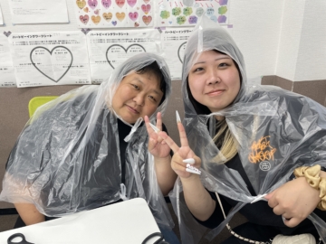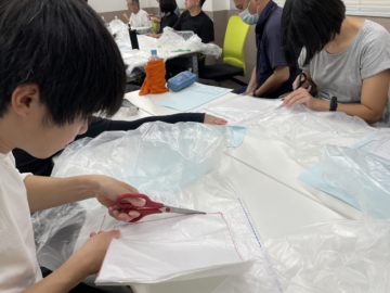 45Lのゴミ袋に型紙を入れ、順番に切り込んでいきます。始めにポンチョを着用して皆さんに見てもらいましたが、実際ゴミ袋のどこがフードになるのか、紐になるのかわかりませんよね??完成して着用して初めて、歓声が上がりました。