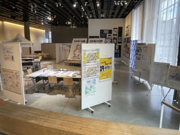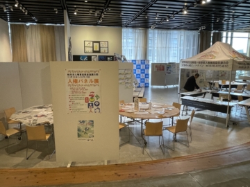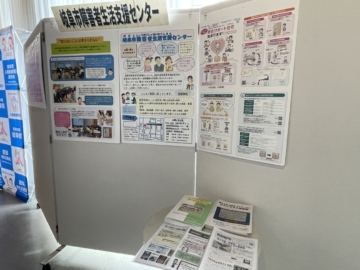 当センターは、センター紹介のパネル、知らないことは考えられないとして生活便利グッズ工作教室・自助具の講習会・人権学習講座をまとめたパネル、居住サポート住宅始まりますのパネル、コミュニケーションが取れない支援ヘルプシールパネルの4枚のパネルを展示し、センター紹介・出前講座紹介のリーフレットを机上に置き来場者の手に触れやすいようにしました。