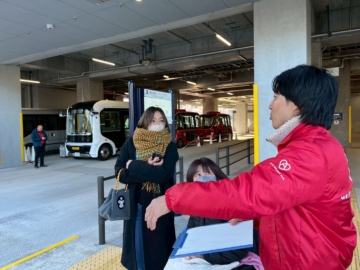 岐阜駅のバス停留所は「3番」のところに赤色の「GIFU HEART BUS」の停留所もありました。岐阜バスさんにご協力いただき、岐阜駅に一番入りやすい「3番」に停めさせてもらうことができたんだって。他機関との連携って素晴らしいですね♪