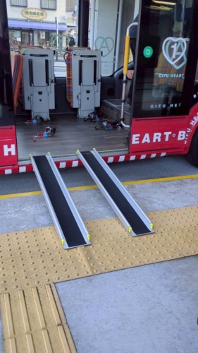 同乗者(介助者)または「GIFU HEART BUS」に同乗する職員さんが乗車をお手伝いしてくれるので、車いす使用者は自走でスロープを渡ることはないそうです。